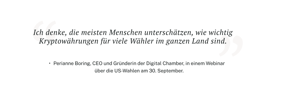 In naher Zukunft könnten die Ergebnisse der US-Wahlen als Auslöser für ein neues Allzeithoch bei Bitcoin dienen und auch eine Erholung für kleinere Assets einleiten, die in diesem Jahr zurückgeblieben sind. Wir bleiben optimistisch bezüglich der Entwicklung der Krypto-Asset-Klasse auf mittel- und langfristige Sicht.