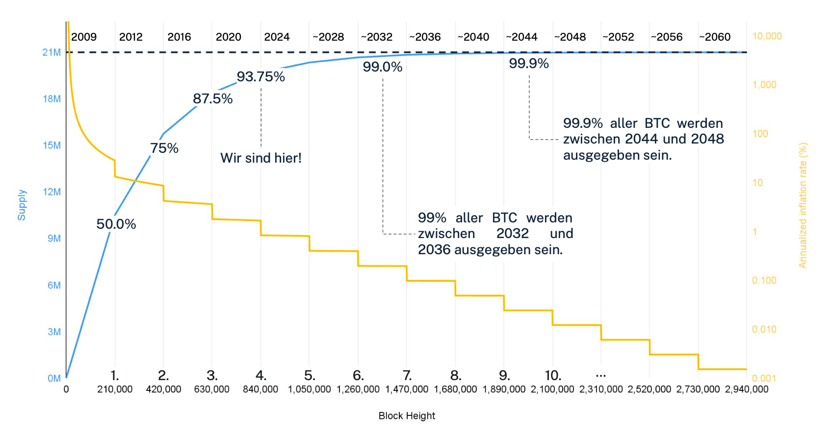 Halbierungen reduzieren die Inflationsrate von BTC und gewährleisten, dass die fixe Obergrenze des BTC-Angebots in transparenten und regelmäßigen Abständen erreicht wird.