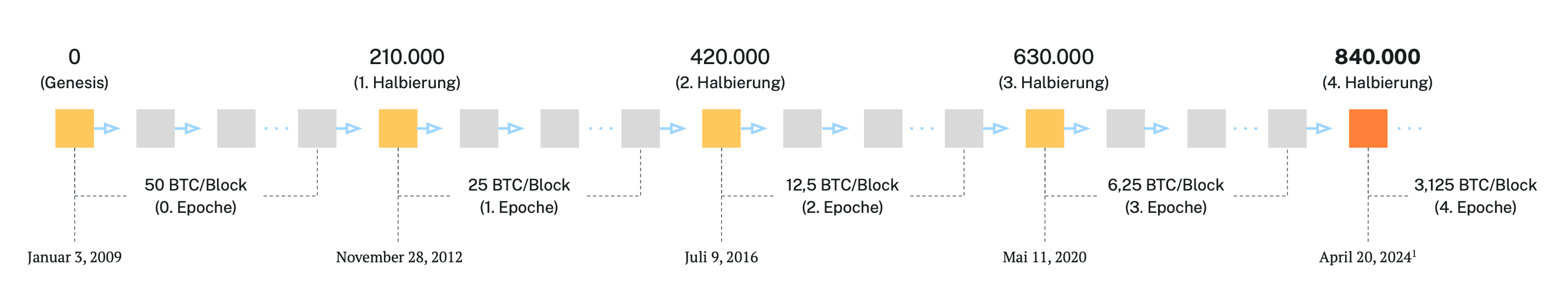 Sie finden alle 210.000 Blöcke2 statt, beginnend mit dem ersten Block von Bitcoin. Bei einer Blockzeit von 10 Minuten liegt der Abstand zwischen zwei Halbierungen bei etwa 4 Jahren.3
