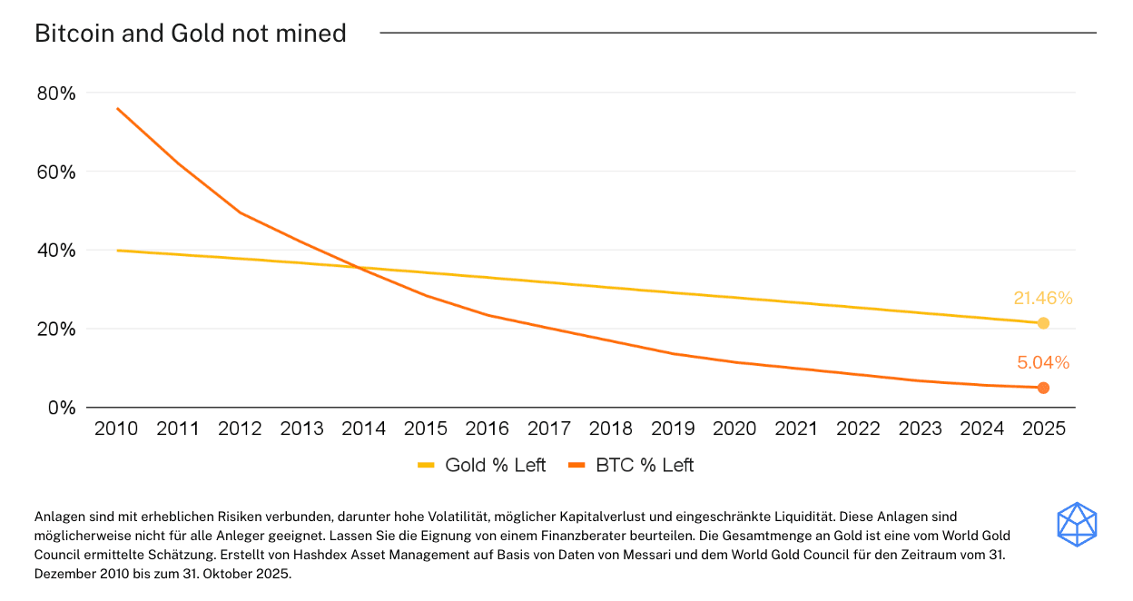 Während beide Assets ein begrenztes Angebot haben, stärkt Bitcoins fest kodierte Knappheit – mit einer fixen Obergrenze von 21 Millionen Coins – die Argumente für Bitcoin als noch potenteren Wertspeicher als Gold, trotz seiner kürzeren Historie.