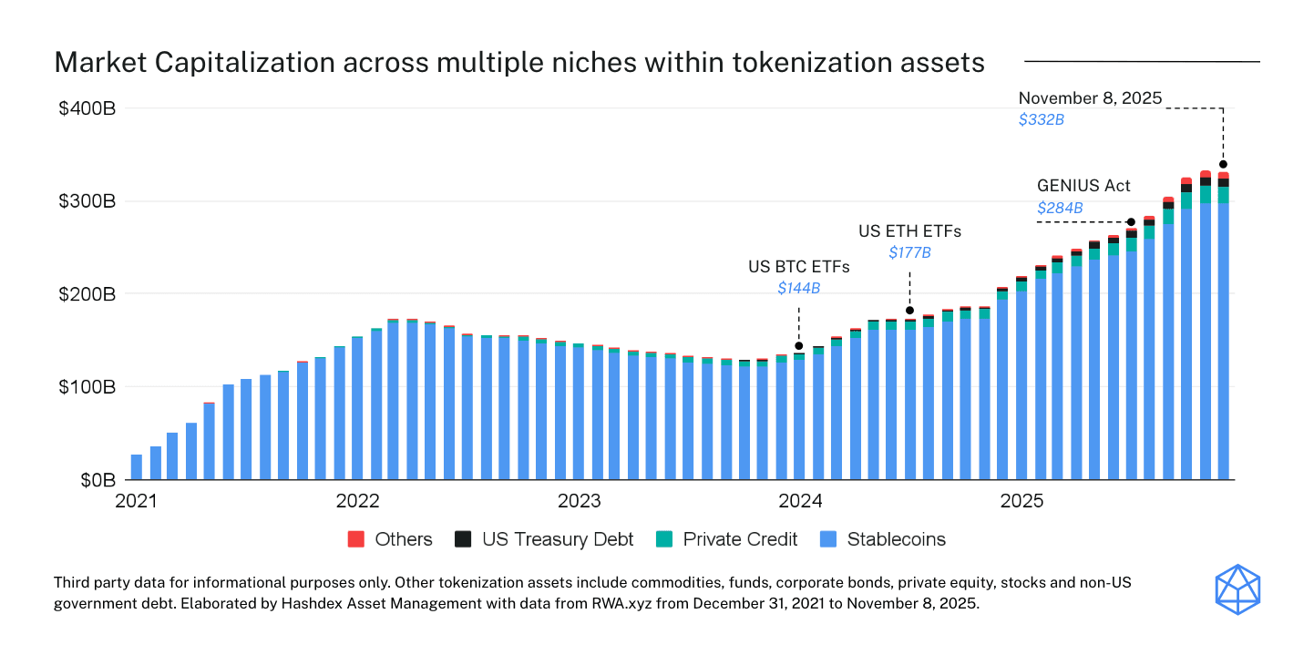 Currently, non-stablecoin tokenized assets total $36B—out of $332B in total tokenized value—, but they hold the potential for even deeper integration with traditional finance.