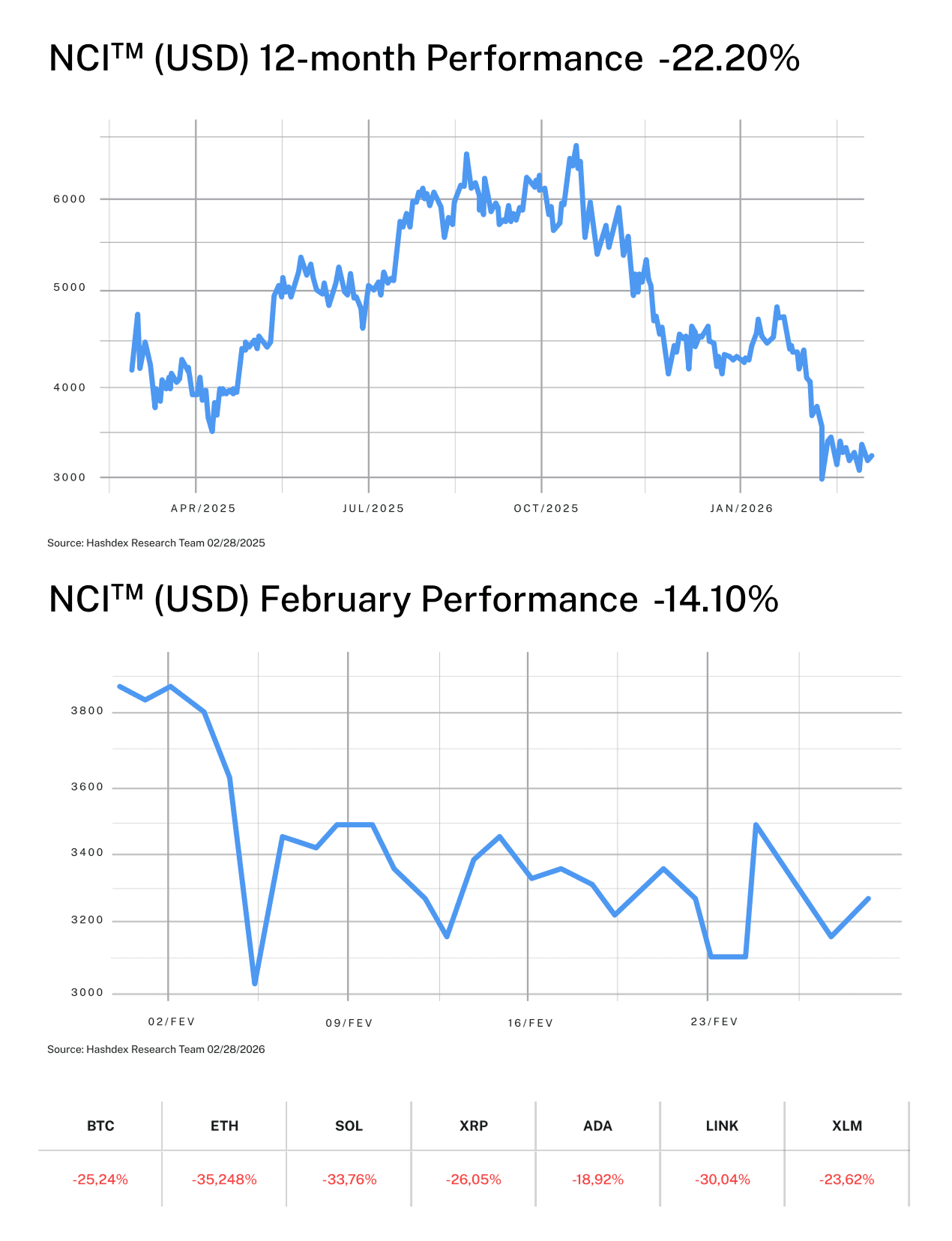 For investors with conviction in digital assets’ long-term potential, February’s drawdown—while severe—occurs within an asset class that has recovered from worse. The NCI’s market cap-weighted methodology provided meaningful protection during the decline, and strategies incorporating gold exposure demonstrated how thoughtful portfolio construction can preserve capital through volatility. Patient capital rarely regrets staying the course during capitulation events.