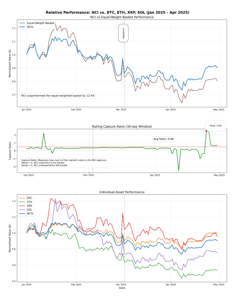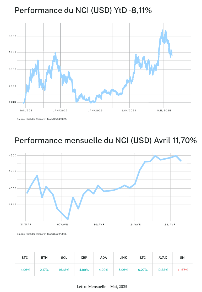 La configuration des marchés en avril illustre bien les avantages des indices pondérés par la capitalisation boursière comme le NCI. Alors que le NCI a enregistré une hausse globale de 11,70 %, les performances individuelles ont été très disparates : de +18,40 % pour Solana à -1,63 % pour Ethereum. Cette dispersion met en évidence l’intérêt de la diversification intégrée à ce type d’indice, qui permet d’amortir la volatilité typique des crypto actifs.
