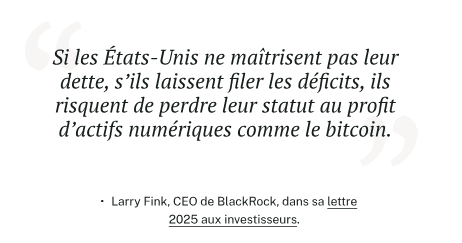 Dans sa lettre annuelle aux investisseurs, le PDG de BlackRock a affirmé que le bitcoin pourrait remettre en question le statut de monnaie de réserve du dollar américain. Ce message traduit des inquiétudes croissantes face à l’endettement des États-Unis et renforce la thèse du bitcoin comme actif refuge face au risque de dévaluation monétaire.