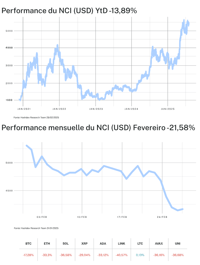 Les actifs du NCI™ ont enregistré des baisses marquées. La pire performance a été celle de LINK, qui a chuté de -40,57 % sur le mois. Seul un actif a réussi à rester en territoire positif : LTC, qui a terminé février quasi inchangé avec une légère hausse de 0,13 %. BTC et ETH ont également subi de lourdes pertes, avec des reculs de -17,28 % et -33,30 %, respectivement.