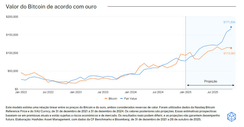 Ao modelar o preço do bitcoin em relação ao ouro, observa-se que, apesar da correlação moderada, ambos demonstram uma relação de valor subjacente — o bitcoin e seu valor justo baseado no ouro tendem a se mover de forma relativamente alinhada.