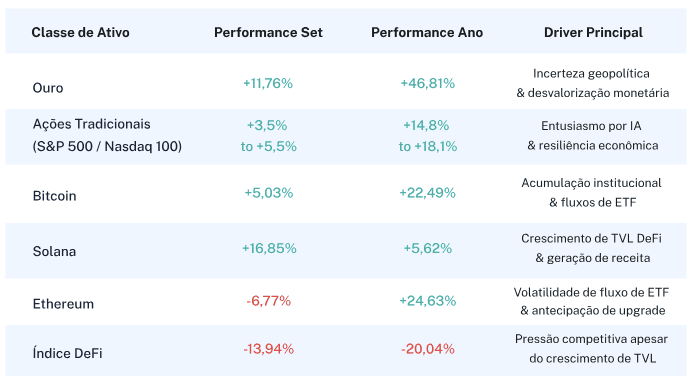 Esta tabela revela que cada classe de ativo agora responde a drivers fundamentais distintos em vez de se mover em sincronia com o sentimento macro. O ouro se beneficiou de tensões geopolíticas e fraqueza do dólar (DXY em queda de 10,24% no acumulado do ano). Ações tradicionais surfaram otimismo em IA e lucros corporativos. Bitcoin atraiu alocação de tesouraria institucional. Solana capitalizou no crescimento do ecossistema. Ethereum navegou a transição de especulação para infraestrutura. Tokens DeFi lutaram apesar do sucesso dos protocolos—um fenômeno clássico de ciclo tardio onde detentores de equity não capturam todo o valor.