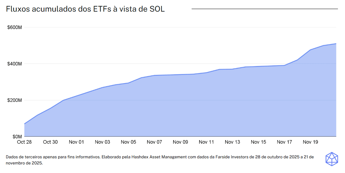 Os ETFs de Solana têm registrado aportes diários constantes desde o lançamento no final de outubro, acumulando mais de US$ 500 milhões ao longo de novembro, apesar de SOL ter caído 30% durante o mesmo período. Essa divergência entre forte demanda e desempenho de preço fraco contrasta fortemente com os ETFs de Bitcoin e Ethereum, que juntos registraram saídas de US$ 4,4 bilhões em novembro à medida que cripto recuou de suas máximas de outubro.