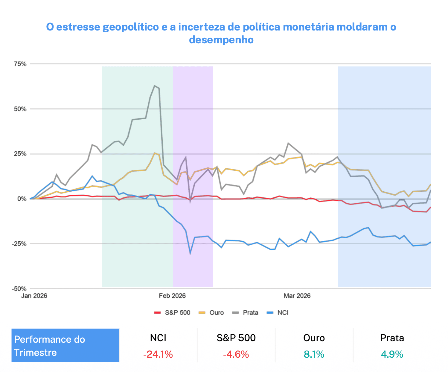 Surpresas geopolíticas e monetárias impulsionaram reversões de tendência e as maiores oscilações de preço do primeiro trimestre.