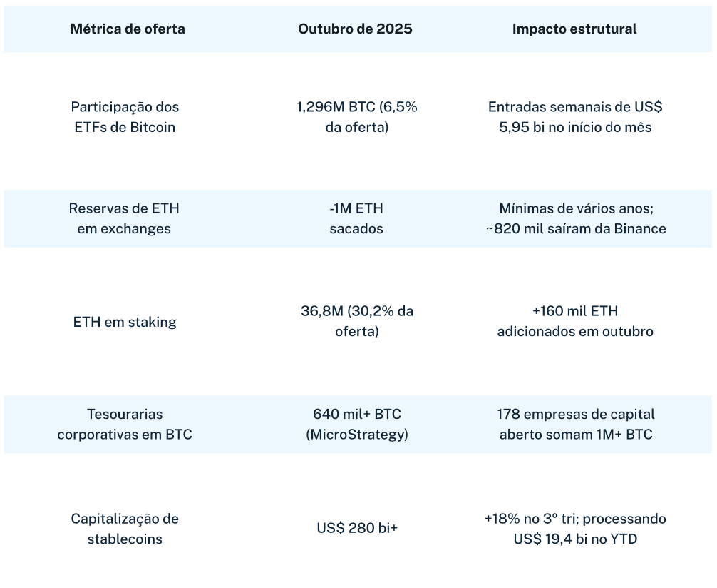 Quando 6,5% da oferta de Bitcoin está em ETFs que raramente vendem, quando 30% do Ethereum está bloqueado em contratos de staking e quando as exchanges reportam os menores saldos desde 2018 — essas condições criam cenários assimétricos em que aumentos modestos de demanda podem gerar respostas de preço desproporcionais. O evento de liquidação de 10 de outubro — que eliminou US$ 7 bilhões apenas na primeira hora — purificou o mercado do excesso de alavancagem, enquanto o IBIT da BlackRock continuou sua marcha rumo aos US$ 100 bilhões em ativos — o ETF mais rápido da história a atingir esse marco.