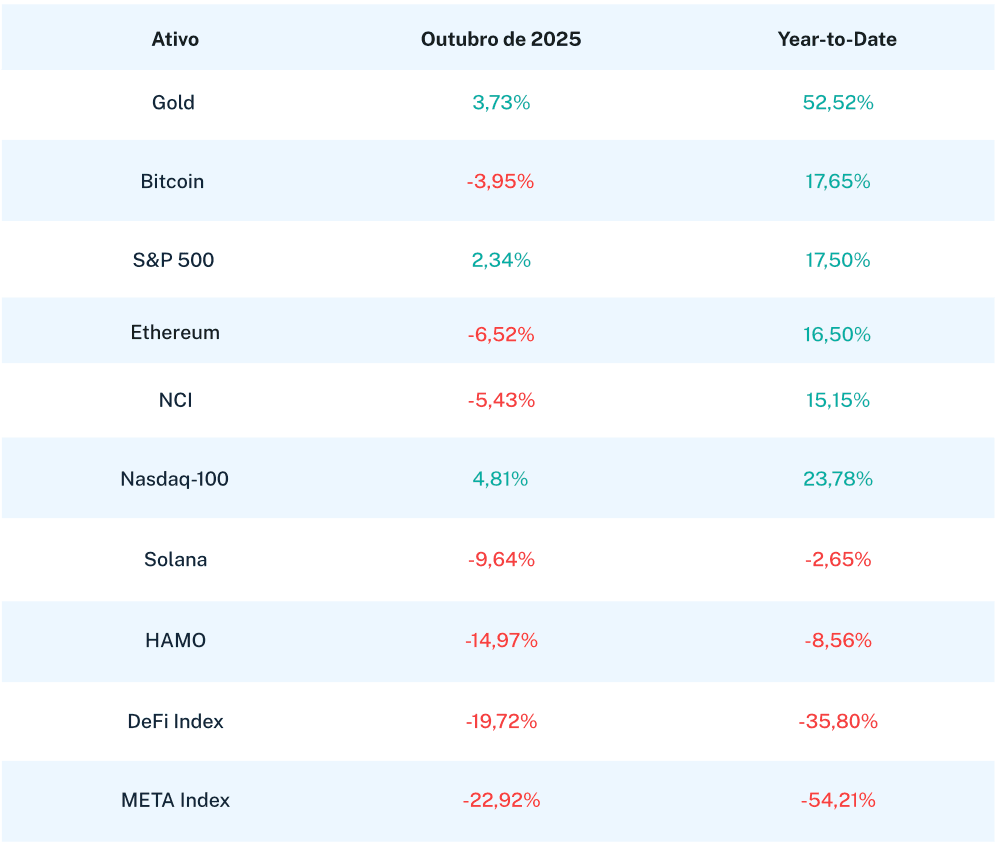 Os mercados tradicionais navegaram a volatilidade de outubro com compostura. O S&P 500 subiu 2,34%, marcando o sexto avanço mensal consecutivo, enquanto o Nasdaq-100 avançou 4,81%, impulsionado pelo entusiasmo com IA e lucros robustos. O ouro emergiu como o campeão de outubro, saltando 3,73% e levando seu ganho no ano a extraordinários 52,52%, tocando brevemente o recorde de US$ 4.381 por onça. O corte de juros do Federal Reserve em 29 de outubro, de 25 pontos-base, para 3,75%–4,00%, veio com um tom surpreendentemente “hawkish”, quando o presidente Powell afirmou que um corte em dezembro “não é um fato consumado — longe disso”.