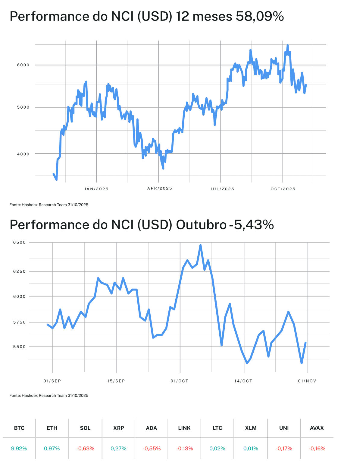 O descompasso entre preços em deterioração e fundamentos em melhoria cria oportunidades assimétricas. A lição de outubro é clara: foque nas forças estruturais, não no ruído de curto prazo. O aperto de oferta é real. A adoção institucional está acelerando. Quando métricas de adoção e mecânicas de oferta se impuserem na descoberta de preços, investidores com exposição sistemática por veículos como o NCI estarão posicionados para se beneficiar.