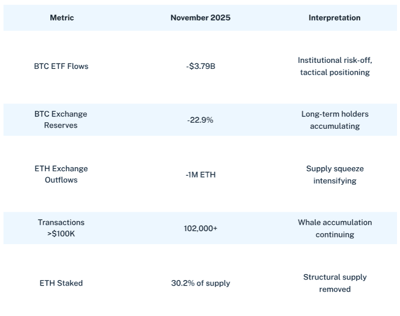 November's most instructive lesson lies in understanding what the headlines didn't capture. While ETF outflows dominated financial media, on-chain metrics told a different story. Bitcoin exchange reserves fell 22.9% from November 19-25, dropping from 2.37 million to 1.83 million BTC—the lowest since 2018. Over 102,000 transactions exceeding $100,000 occurred during November, as patient capital accumulated while institutional products shed assets.