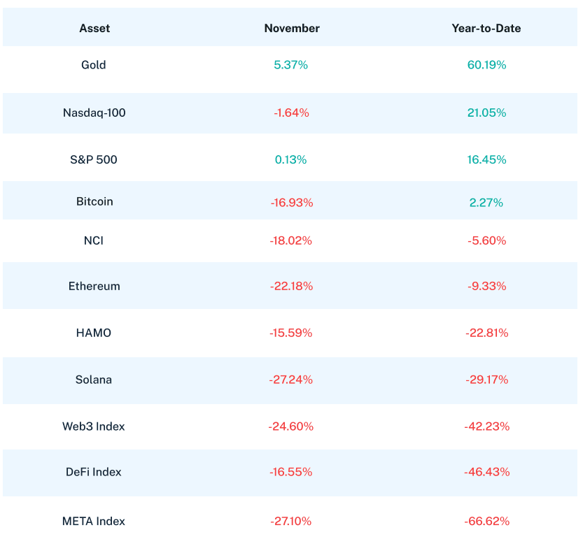 Year-to-date returns through November 30 reveal gold's dominance and crypto's struggles: