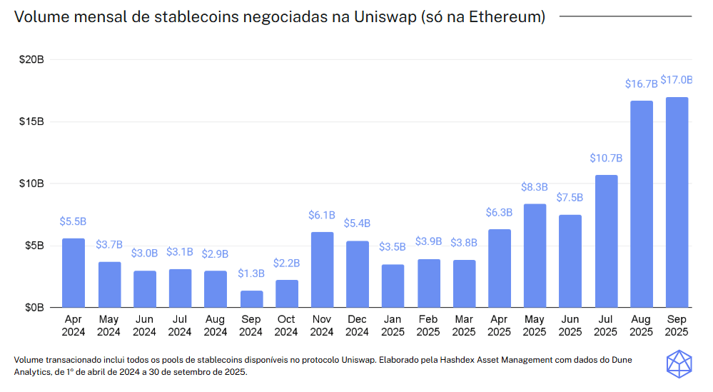 Uniswap, maior exchange descentralizada do mercado, ilustra bem essa dinâmica. Nos últimos 12 meses, o volume de stablecoins negociadas na plataforma apresentou uma forte tendência de alta. Somente na rede Ethereum, o volume total de swaps disparou de US$ 1,3 bilhão em setembro de 2024 para US$ 16,9 bilhões no último mês, evidenciando o crescimento da demanda e da atividade não apenas em DeFi, mas especialmente no uso de stablecoins.