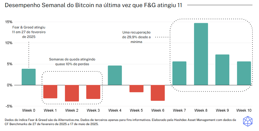 O indice Fear & Greed (“Medo e Ganância” em português) atingiu 11 em 21 de novembro—um dos níveis mais baixos já registrados—e permaneceu no território de "Medo Extremo" por 18 dias consecutivos. Esta é a segunda vez este ano que observamos um medo tão extremo.